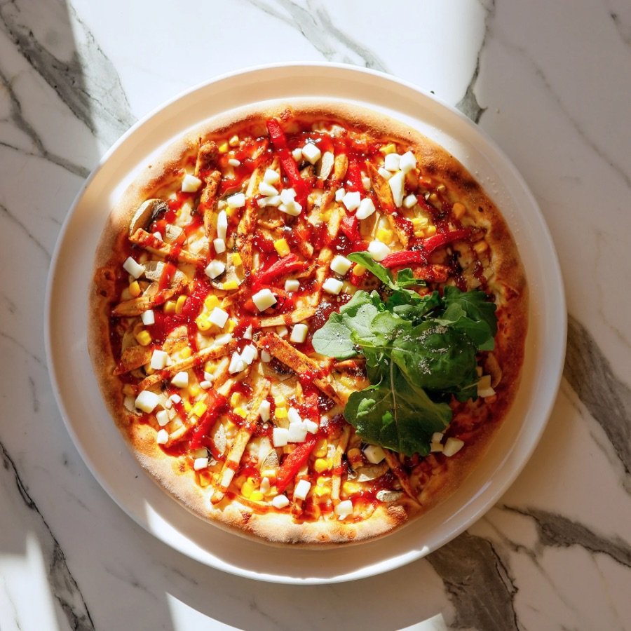 Tavuk Parçaları, Özel Domates Sos, BBQ Sos, Suda Mozzarella, Rende Mozzarella, Köz Biber, Kurutulmuş Domates, Mantar, Roka.