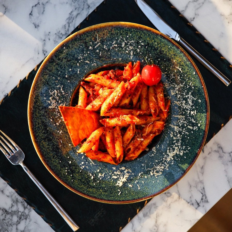 Izgara Et Parçalar, Domates Sos, Permesan, Taze Fesleğen.