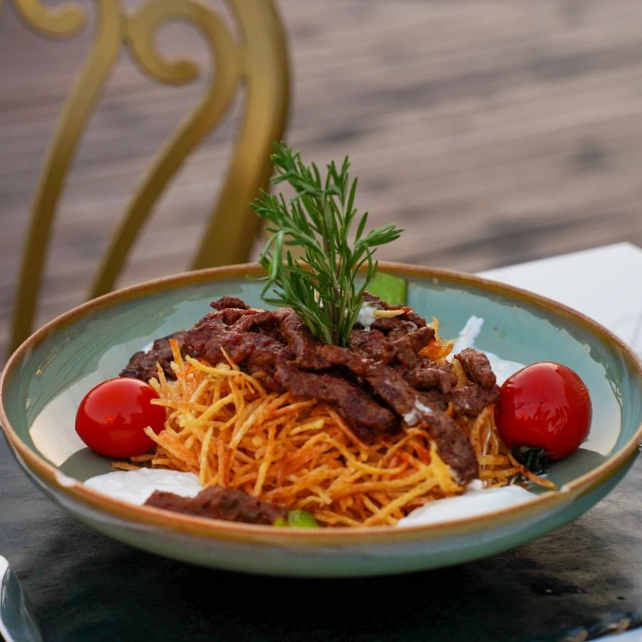 Bonfile Dilimleri, Kibrit Patates, Süzme Yoğurt, Özel Domates Sos, Közlenmiş Biber ve Domates.