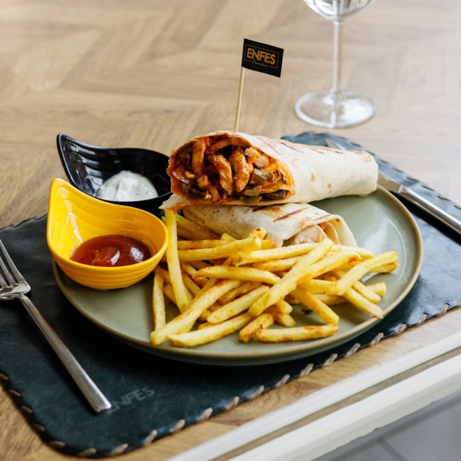 Tortilla Ekmeğine Tavuk, Kırmızı Biber, Yeşil Biber, Mısır, Mantar, Jalapeno Turşusu, Mexico Sosu, Cips, Yeşillik.
