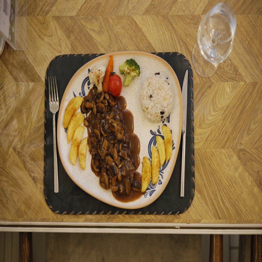 Dana Bonfile, Risotto, Mantarlı Demi Glace Sosu, Cips, Közlenmiş Domates ve Biber.
