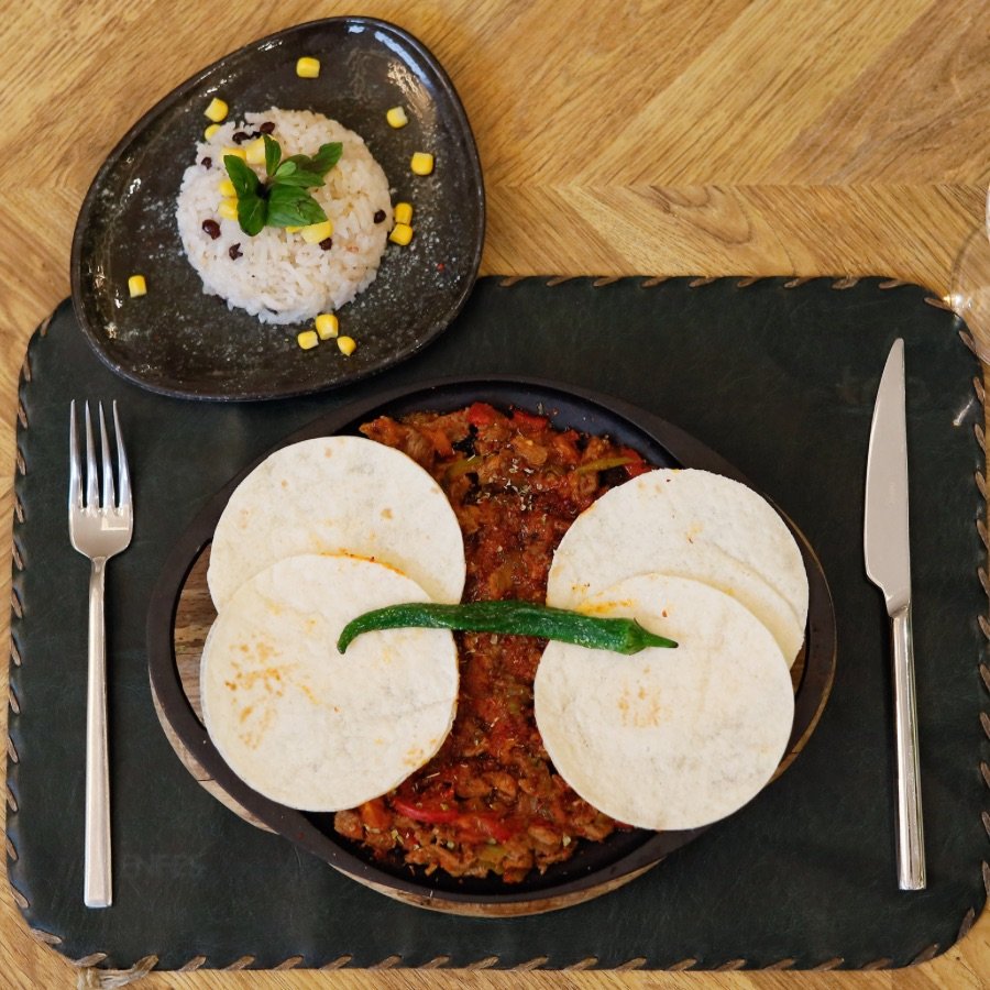 Küçük Doğranmış Dana Bonfile, Domates, Kırmızı Biber, Yeşil Biber, Sarımsak, Pilav.