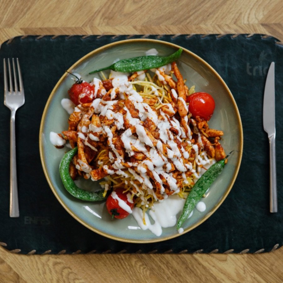 Tavuk Bonfile, Domates Sos, Kibrit Patates, Közlenmiş Biber ve Domates.