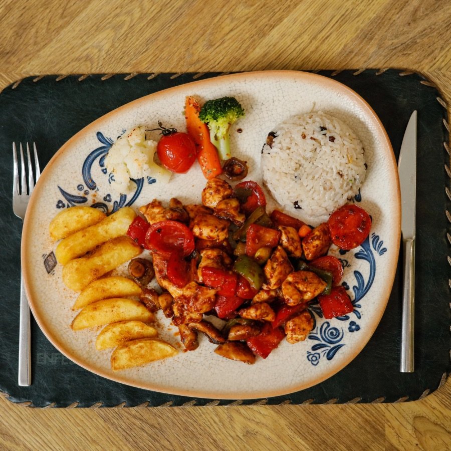 Tavuk Bonfile, Yeşil ve Kırmızı Kapya Biber, Mantar, Sarımsak, Pilav, Cips, Garnitür.